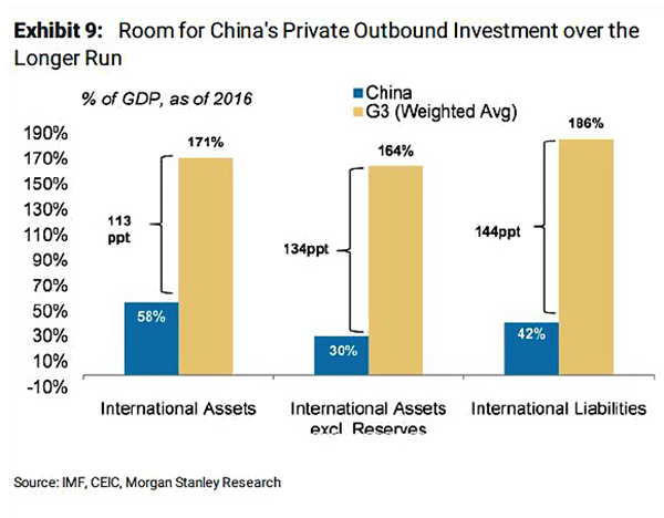 2016年中国私人部门持有的海外资产仅为GDP的30%,而G3国家的加权平均值则为164%(下图),长期来看海外投资还有很大的提升空间。