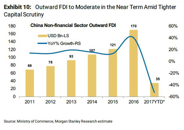 据大摩估算,中国对外非金融类直接投资 (ODI) 将年环比下降达60%,从2016年的1700亿美元降至2017年的700亿美元(下图)。