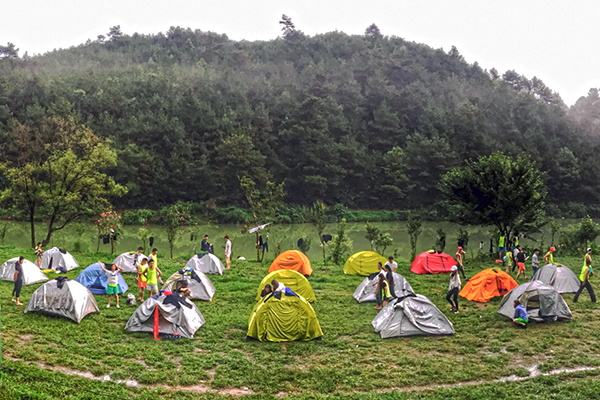 天蓝蓝,水莹莹, 八月的惠水,风光正妩媚。我们一行四十余人来到贯穿公园的翁吟河边,安营扎寨,与山为邻,与河为伴,数着星星入眠,伴着鸟鸣晨起,体验此次浪漫的森林露营之旅。大家陆陆续续扎好帐篷,河岸边立马生动起来,远远看去,那些五颜六色的帐篷就像是一朵朵绽放的野菊,煞是好看。不少人都站在自己的帐篷前拍照留念,他们大都是第一次参加露营活动,激动之情自然是溢于言表。
