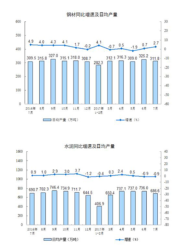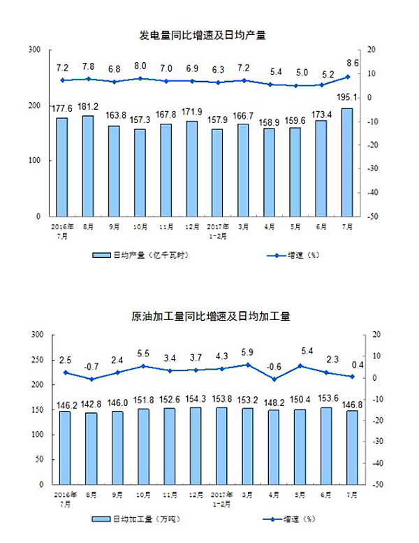 分产品看,7月份,596种产品中有398种产品同比增长。其中,钢材9667万吨,同比增长2.7%;水泥21283万吨,下降0.9%;十种有色金属447万吨,同比持平;乙烯148万吨,增长1.0%;汽车207.3万辆,增长4.3%;轿车86.6万辆,下降3.7%;发电量6047亿千瓦时,增长8.6%;原油加工量4550万吨,增长0.4%。