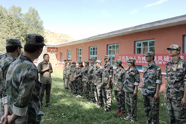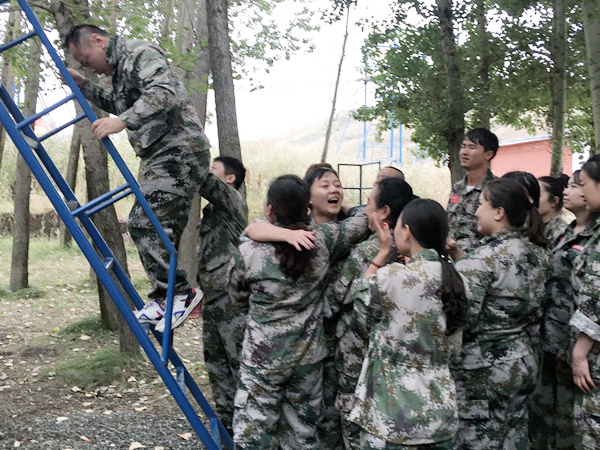 稍作调整后,第二项就是开营破冰、组建团队文化,教官把我们分成两队,开始选拔队长,选定队名、口号和队歌。我们分别产生了“战狼队”和“刀锋队”,开营仪式比较军事化,庄严而神圣。仪式结束,教官直接带领大家走到了“背摔”场地,每次选出一人走到矮墙上,将双手绑在自己的胸前,背朝墙下,身体站直了向后倒下去,剩余的人员会面对面站成两排伸出双手接住倒下的人。背摔游戏充分发挥出了我们团队的合作意识,学会了战胜自己、相信同伴、信任部下。