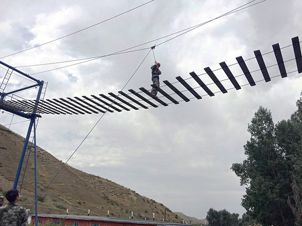 午休一共50分钟,吃完午饭回宿舍等待集合(听见哨声后30秒钟内必须集合完毕)。很准时,快到3点10分,哨声响起,集合整队向高空项目场地出发。第三个项目让我们心里一惊——飞夺泸定桥。高八米的空中索桥,一个人背扣安全带徒手爬上去后,走到索桥的中间,转身从8米的桥面跳到地面,当然,全程都是有其他同伴们使劲拉着桥上人员背后的安全带的,所有人都在保护着桥上的人。看似简单的项目,当队员挑战时又感觉到巨大的恐惧,“高空一小步,人生一大步”,当战胜自己内心恐惧顺利着地的时候,大家都充满了成功的喜悦,对未来更有信心和动力。经过两个多小时,每个人都成功的完成了挑战,内心无比畅快!