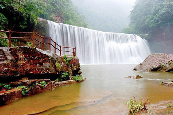 午餐后继续游览“中国•赤水丹霞”世界自然遗产地核心景区——佛光岩景区。雄伟壮观的丹霞赤壁——佛光岩犹如一本巨大的天书摊开在半天云海之上,一挂瀑布一倾而下,正如“飞流之下三千尺,疑是银河落九天”般景象。雄壮的赤壁与舞动的飞瀑两者动静结合,特别是在有阳光的午后,鲜红的赤壁与多彩的飞虹想呼应,完美的展现出自然与和谐。在这里可以体验新、奇、险、秀、幽、野六大特色为一体的神韵。