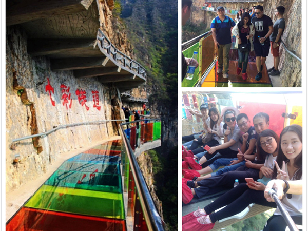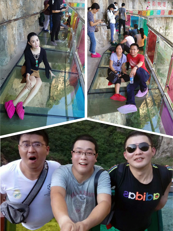 走在七彩玻璃栈道上,犹如踩着一条长长的彩虹桥,惊险刺激而又不失浪漫梦幻。不过有的同事吓到腿软,扶着墙才能走完;也有同事如履平地,在栈道上各种自拍。