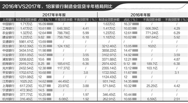 记者梳理主要上市银行2016年年报和2017年半年报相关数据,包括制造业贷款余额、占贷款总额比例、不良贷款率等,观察制造业贷款变化趋势。