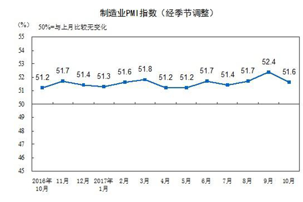 2017年10月份,中国制造业采购经理指数(PMI)为51.6%,比上月回落0.8个百分点,达到今年均值水平,制造业延续扩张的发展态势。