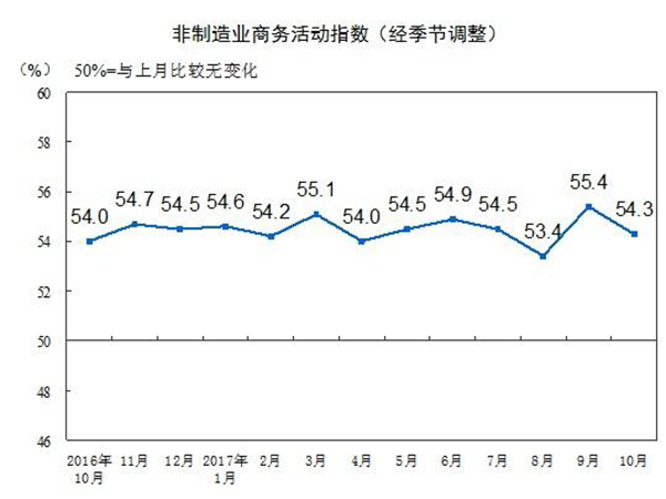10月份,中国非制造业商务活动指数为54.3%,比上月回落1.1个百分点,但高于去年同期0.3个百分点,非制造业继续保持平稳较快的增长态势。