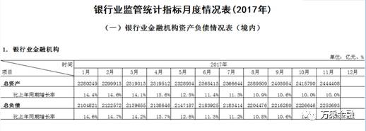 12月25日,银监会公布了2017年11月末银行业监管统计指标月度情况表。情况表显示,截至2017年11月末,银行业金融机构(境内)总资产规模约总额244.44万亿元,同比增加10%;总负债为225.37万亿元,同比增长10%。