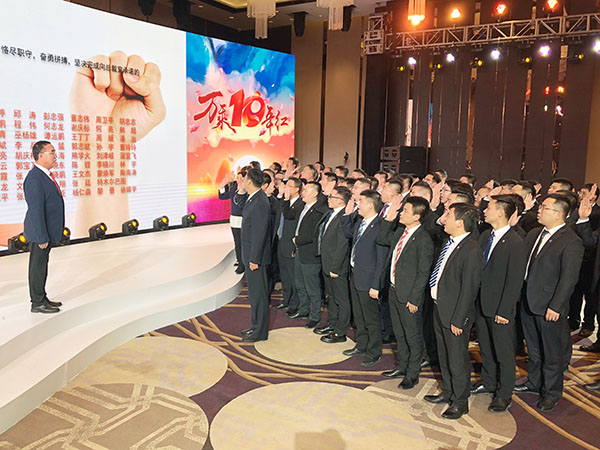 会议最后,为更有效率地推动集团全年各项工作任务的顺利完成,在董事会秘书兼行政人事部总经理刘润东的主持下,总裁室与各营业机构签订了2018年利润指标承诺书。在副总裁崔明绪的带领下,63家营业机构总经理室成员向总裁室宣誓:将带领团队,恪尽职守,奋勇拼搏,坚决完成向总裁室承诺的2018年利润指标!