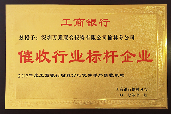 2018年2月5日,榆林万乘荣获工商银行榆林分行授予“2017年度催收行业标杆企业”奖牌。