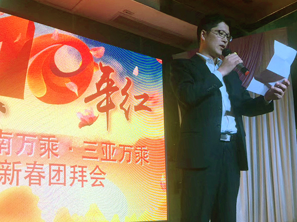 首先,海南万乘兼三亚万乘总经理李总上台为大家致辞,李总对17年的工作情况进行了总结,并对全体员工的辛勤努力进行了感谢,表达了对公司继续发展壮大的期许,李总的讲话饱含深情,令人振奋,定会将全体员工拧绳聚力,让公司在2018年的发展中更上一个台阶。