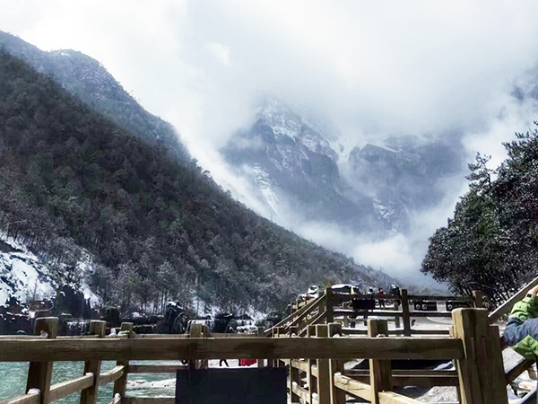 第四站:往前行驶,换了索道,登上有着玉龙第三国神话的云杉坪,仿佛进入人间仙境一般,淡妆素裹,晶莹剔透玉雪,指引我们通往玉龙雪山观景台,沿着木板栈道走进白雪深处云杉坪,雄伟的玉龙雪山近在咫尺,千年冰川云雾缥缈,时而隐约可见,时而躲如云层。突然,一束光照射下来,玉立雪山显现出来,云雾包裹着半山腰,让人感受着雪域仙山神圣之魅力。
