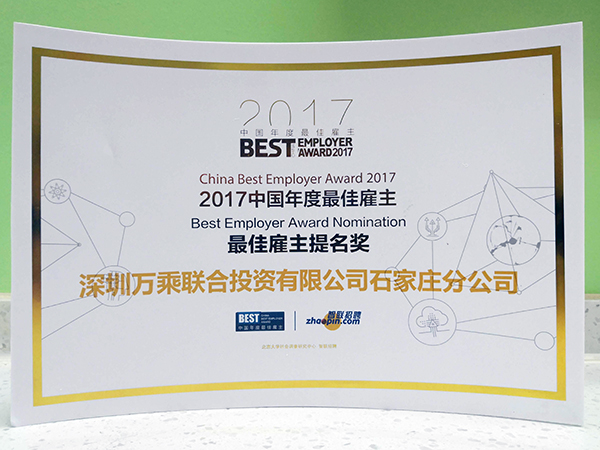 2018年1月,由北京大学社会调查研究中心和智联招聘联合发起的“2017中国年度最佳雇主”活动评选近日揭晓:石家庄万乘从万余家参评企业中脱颖而出,荣获智联招聘颁发“2017年度中国最佳雇主提名奖”的荣誉证书。