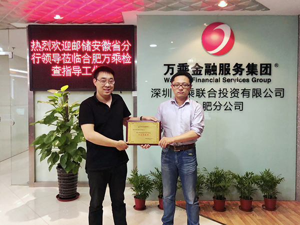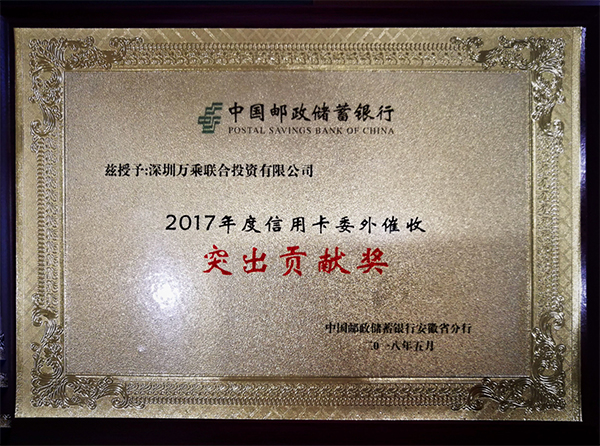 2018年5月9日,中国邮政储蓄银行安徽省分行领导仇总、许经理一行代表省分行授予深圳万乘联合投资有限公司合肥分公司“2017年信用卡催收突出贡献奖”。合肥万乘总经理孙宇陪同接待并参加授奖仪式。