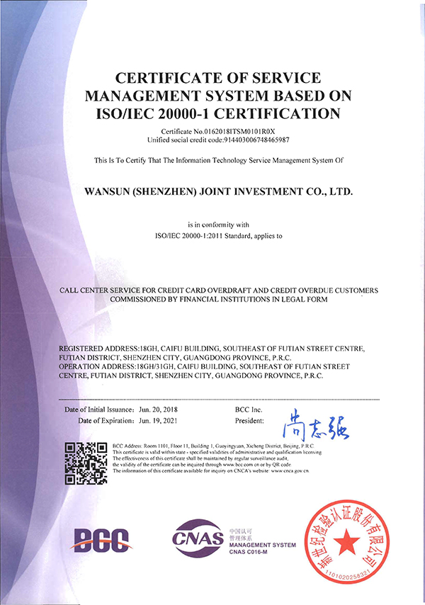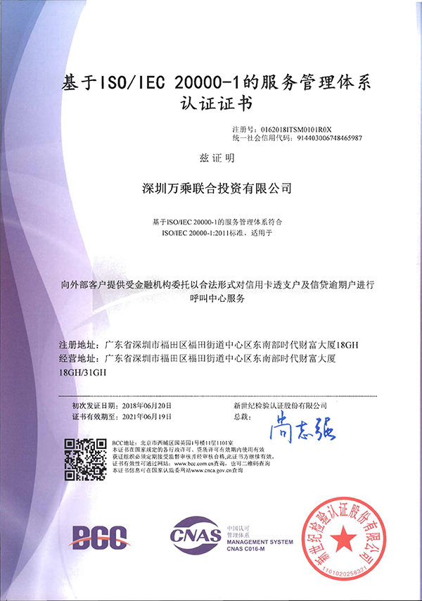 经过近半年的辅导、实施、验证,在集团信息技术管理中心、集团客服中心及其他部门的努力下,近日,深圳万乘联合投资有限公司获得中国认可管理体系认证的服务管理体系证书(ISO/IEC20000-1),证书涵盖了万乘集团及分支机构的所有主营业务,进一步证明了万乘集团在服务管理方面的高质量水平, 也使整个集团的正规化建设又迈上一个新台阶。