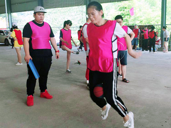 企鹅漫步:用身体指定部位夹住1个球完成队员之间的接力任务。