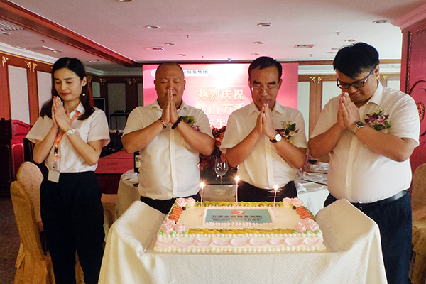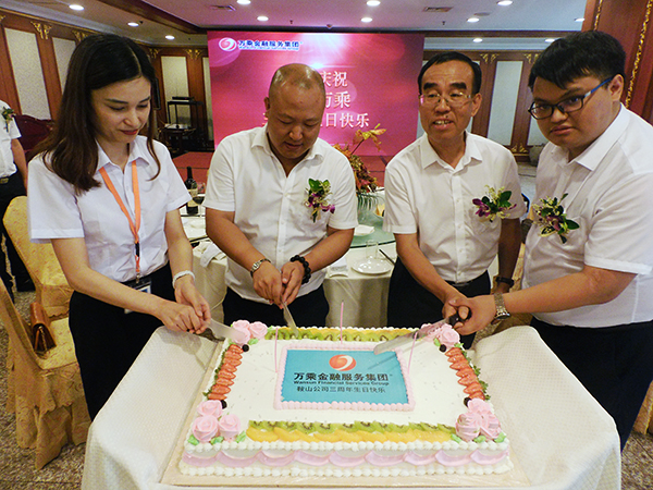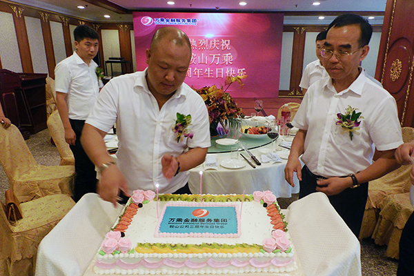 揭牌仪式后,韩总在五星酒店-五环酒店举办"总裁庆功宴",为鞍山全体将士庆功,为鞍山公司3周岁生日庆生。当精美的蛋糕推上来,韩总、刘总、蒲总和优秀员工代表切开生日蛋糕时,现场气氛达到高潮。员工们纷纷表示,这是开心的一天,也是作为万乘人自豪的一天,在今后的日子里,将以更饱满的激情努力工作,为万乘基业长青贡献全部力量!