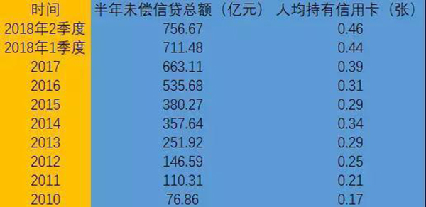 野蛮的网贷平台被严厉监管,导致大量需求流向银行。回看今年前两季度银行信用卡发卡量的大幅增长:平均每人0.46张信用卡,已经比2017年底增长了0.07张,照这样的增长速度,2018年信用卡数量增速很可能再创新高。