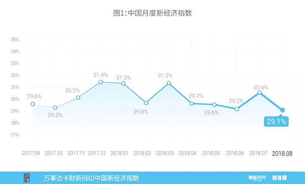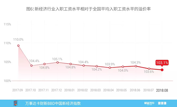 2018年8月新经济行业招聘人数占全国总招聘人数比例26.9%,较上月下降了0.2个百分点,同时,新经济行业招聘总薪酬占全国总薪酬比重27.7%,较上月下降了0.4个百分点。新经济行业的平均入职工资水平相对于全国平均入职工资水平出现下降。2018年8月新经济入职工资“溢价”为3.1%,低于上月3.6%(图6)。本月新经济行业平均工资溢价刷新指数自发布以来的新低。