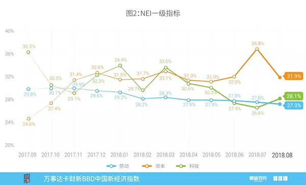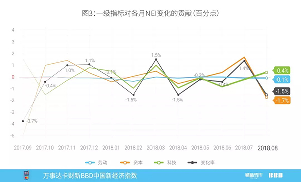 劳动力、资本和科技投入的变化百分比分别为-0.1,-1.7,和0.4个百分点,与权重相乘求和后,对2018年8月NEI变化的贡献值为-1.5%(图3)。