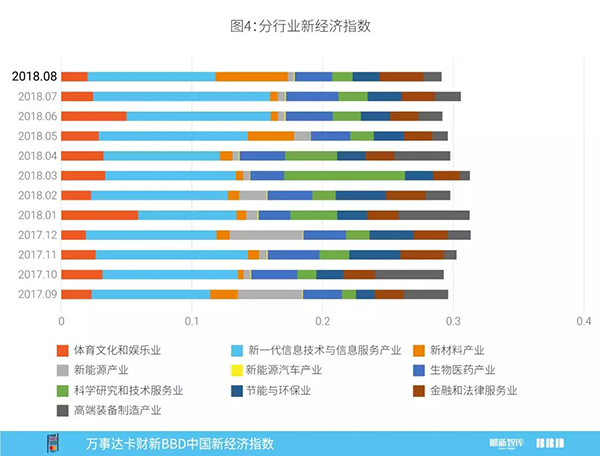 分行业看,NEI中占比最大的行业为新一代信息技术与信息服务产业,2018年8月为总指数贡献了9.8个百分点;本月名次上升最快的行业为新材料产业,贡献率为5.5个百分点,位列第二名;生物医药产业排名下降最多,从上月的第二名下降至本月第四名,贡献率为2.9个百分点(图4)。