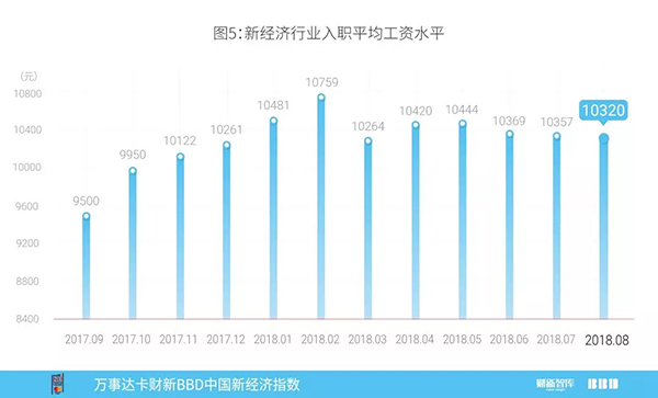2018年8月,新经济行业入职平均工资水平环比下降,为每月10320元,较上月下降37元(图5)。新经济工资主要来自51job、智联招聘、拉钩、赶集网等数个招聘网站的招聘信息,即对劳动力的需求工资。