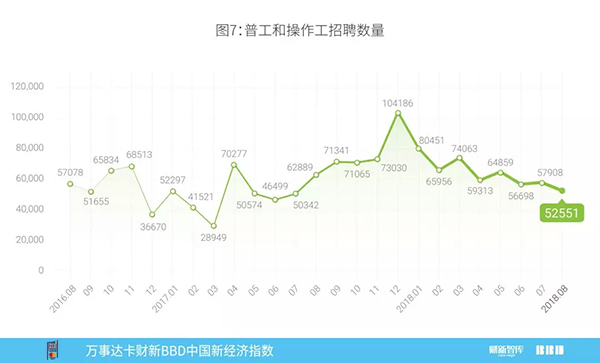 从图7可以看到,普工和操作工的招聘数量本月进一步下降,当前的数量仅为2017年12月的一半左右,该数据与工业增加值增速连续4个月下跌是相吻合的。但值得注意的是,正当工业增加值增速整体下降时,工业企业利润却在逆势上升,这一方面来自去产能之后的价格上涨,另一方面由于大型工业的定价能力和利润正在进一步挤压中小型工业的生存空间。