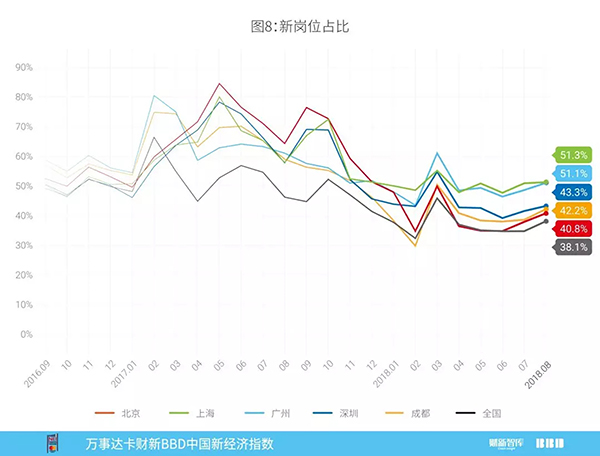其次,我们从新岗位的角度度量各个城市的经济活力,我们将一个公司在某一个城市招聘的一个职位定义为一个“岗位”,当一个岗位在过去90天内没有出现时,我们称它为一个“新岗位”。图8列出了新岗位在每个月招聘数据中所占比重,从全国来看,新岗位的占比从2017年下半年起就在下降,目前已经从2017年6月的57%下降到了38%。分城市来看,上海、广州两地的新岗位占比下降幅度不大,成都其次,而深圳、北京两地新岗位下降速度较快,显示了城市经济活力的流失。