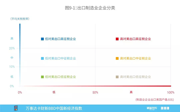 图9关注贸易战的进行状况。我们参考“2016年分笔海关出口数据”和“2018年美国对中国商品加征关税清单”,按照“制造业企业出口美国产值占比”(0-50%、50%-100%)和“平均关税税率”(0-10%、10%-20%、20%以上),将全部出口制造业企业分为6类(图9-1)。