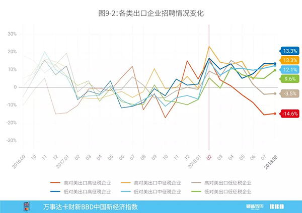 我们在图9-2可以看到这部分企业的招聘同比变化,虽然在今年的2月份,这部分对美出口企业经历了一段较快增长,但从5月开始,对美国出口占比较大且受到税赋影响较重的企业招聘数量开始同比下降,目前已经连续4个月同比下降。从7月开始,高对美出口低征税企业也进入负增长。贸易战对经济的影响也开始逐渐显现。