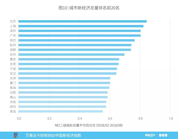 2018年8月新经济总量城市排名前20名如图10所示,北京、上海、深圳、广州和南京排名前五。该排序计算每个投入指标在所有城市中的排序百分位,再将百分位加权平均,体现的是近半年城市间新经济总量排名。