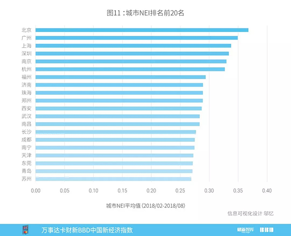 图11计算了2018年2月到2018年8月城市NEI平均排名,前五名为北京、广州、上海、深圳和南京。