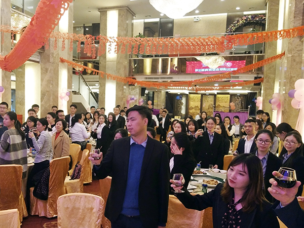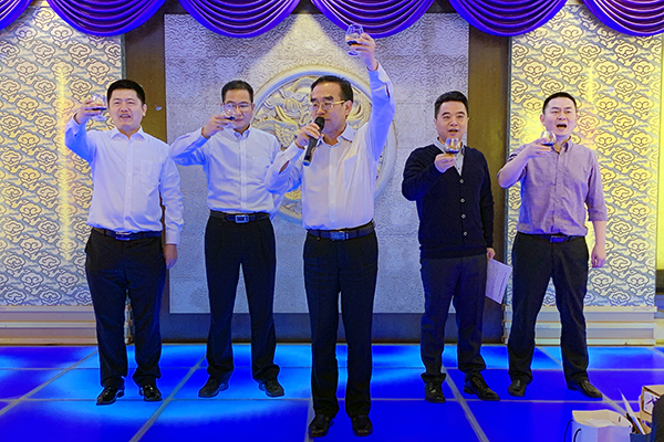 接下来,总裁室领导向万乘人敬酒贺岁!公司领导与全体与会人员共同举杯,致以真诚的新年祝福!