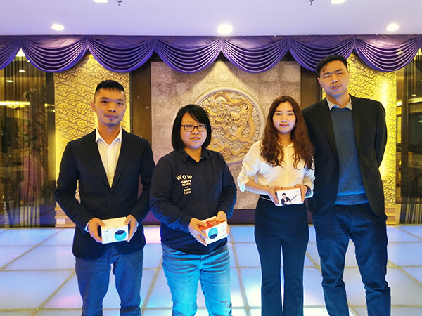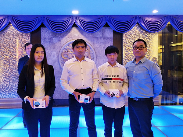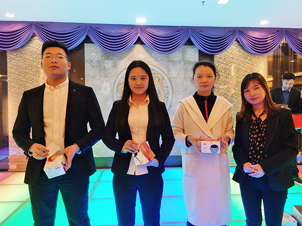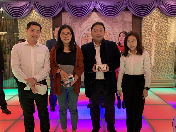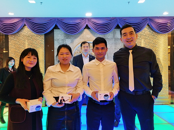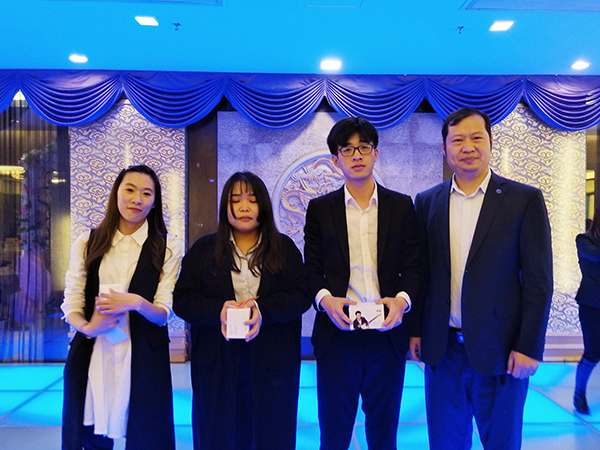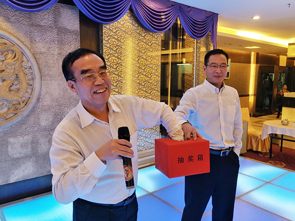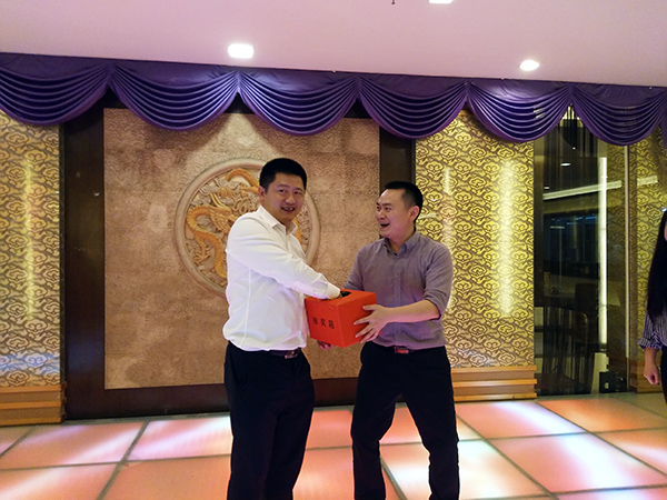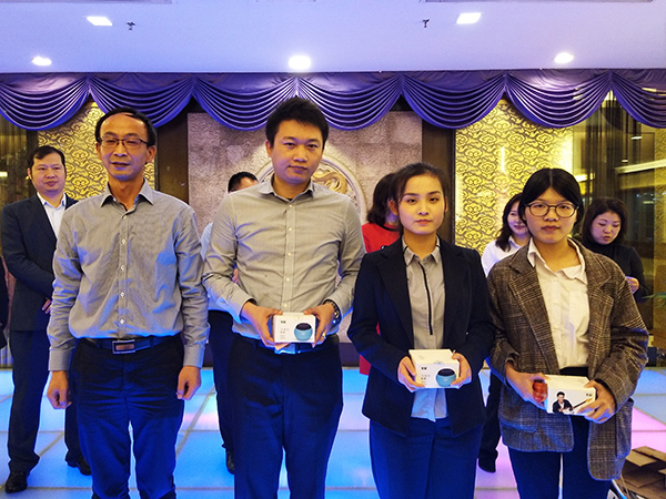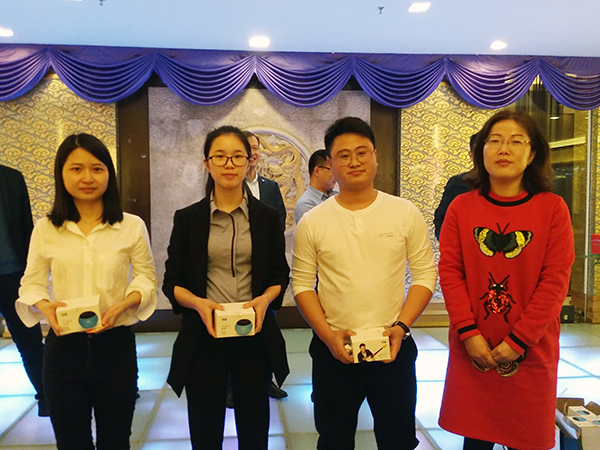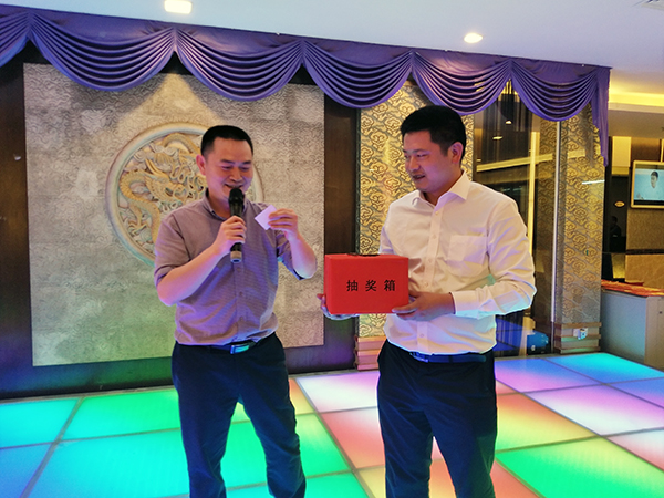 与会人员在入场时即领取了抽奖券,并将副券放入抽奖箱。用餐期间,刘总宣布开始第一轮抽奖环节,由深圳小黑熊科技公司总经理徐靖宇、成都万乘总经理胡庆梅、集团客服中心总经理陈莎、财务部总经理任妍、品牌管理部总经理莫鸿斌、稽核部总经理罗宇超、督导部总经理段学满、培训部总经理助理侯锐泽、客服中心总经理助理刘林雅抽取30个三等奖,奖品为蓝牙音箱。
