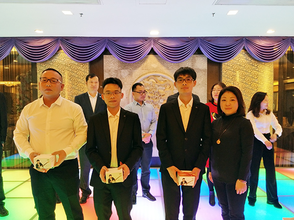 晚上7时,在热烈的掌声中,董事会秘书兼行政人事部总经理刘润东宣布2019年团拜会正式开始!首先刘总请总裁室成员CFO雷波、副总裁杨帅、副总裁周卫平上台,随后请韩总裁上台致新年贺词。韩总说,2019年是万乘全新的一年,希望总部各职能部门继续发扬2018年的拼搏精神,为67家分公司的工作提供强有力的保障,最后,韩总代表总裁室祝大家新年快乐、阖家幸福。