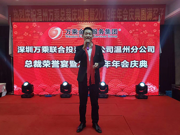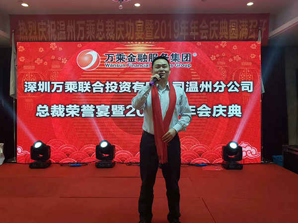 专程赶赴温州的万乘金融服务集团创始人/CEO/总裁韩晓先生在表彰会上发表了热情洋溢的讲话。韩总裁指出,总裁室将2019年的第二场"总裁荣誉宴"安排在温州,是对温州分公司过去一年经营工作的充分肯定,也是一项莫大的荣誉,希望温州万乘珍惜荣誉,继往开来,在2019年奋勇拼搏,取得更好的成绩,为万乘基业长青做出贡献。