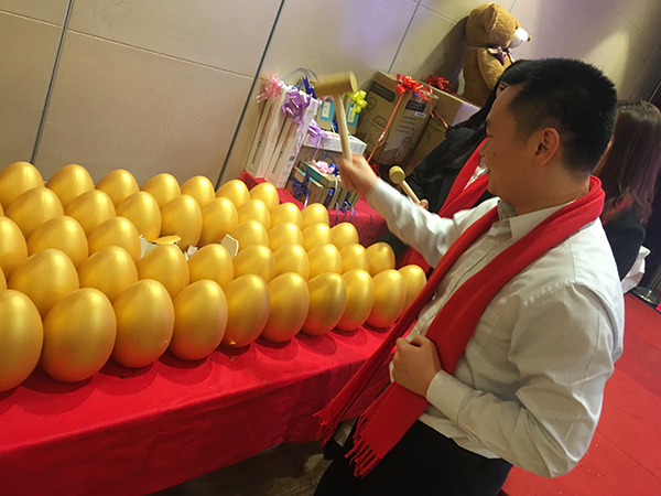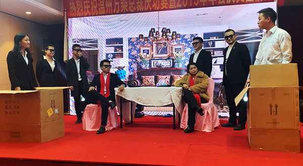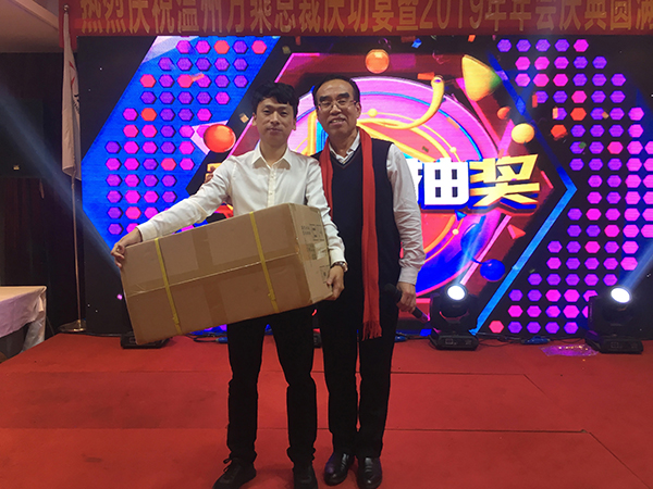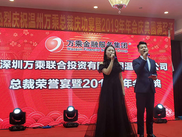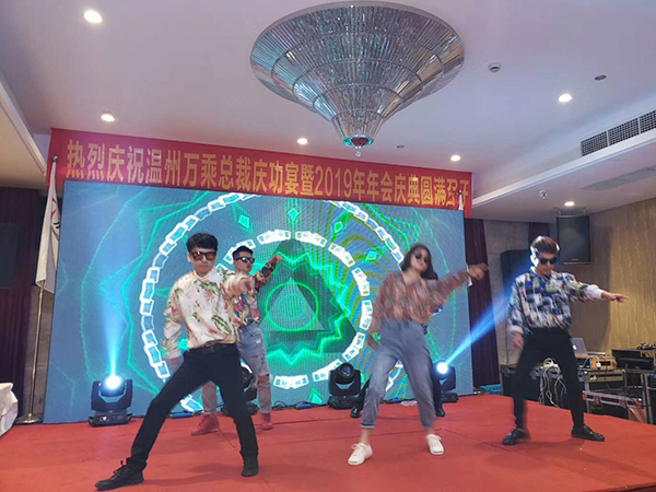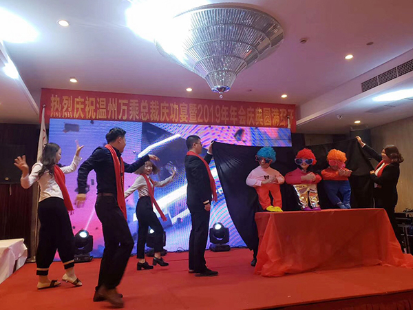 在主持人的主持下,温州万乘员工表演了小品、歌舞、游戏等节目,还穿插了砸金蛋寻宝、抽奖等活动。同时,周副总裁、柯平总还为分公司2019年业绩冠、亚军进行了颁奖。