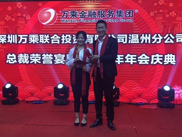 2018年岁末,从瓯江之畔传来喜讯:温州万乘12月份佣金收入突破百万,成为万乘集团第25个百万俱乐部成员。按照万乘集团的荣誉及表彰规定,集团总裁室于2019年1月11日在四星酒店温州瑶溪王朝大酒店为温州万乘举办"总裁荣誉宴",同时进行新春团拜活动。