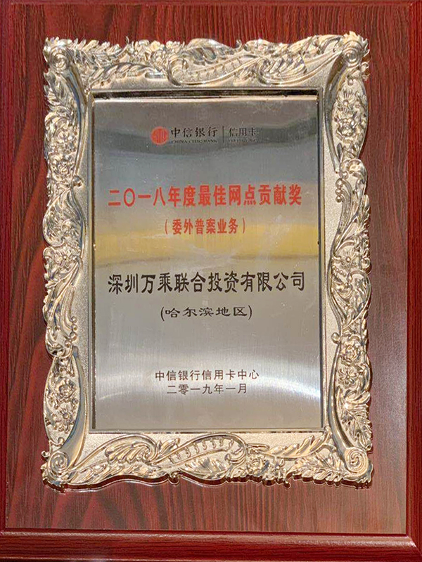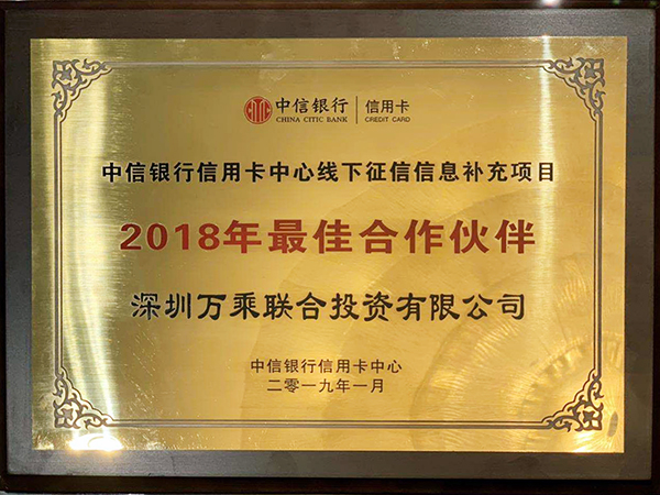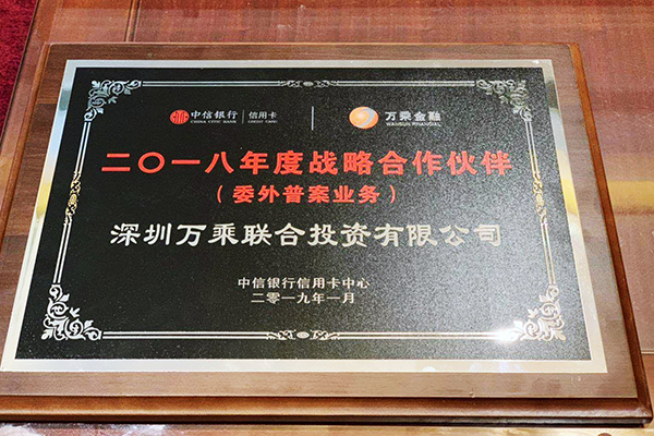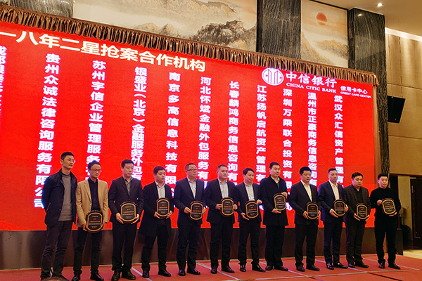 2019年1月17日,中信银行信用卡中心在江城武汉召开"2019年委外资产保全及线下征信工作会议",万乘金融服务集团创始人/CEO/总裁韩晓先生、副总裁杨帅先生应邀出席会议,并代表万乘集团领取了中信银行信用中心颁发的"2018年度战略合作伙伴"、"2018年度线下征信信息补充项目最佳合作伙伴"、"二星抢案合作机构"和"2018年度最佳网点贡献奖(哈尔滨地区)"四项大奖。