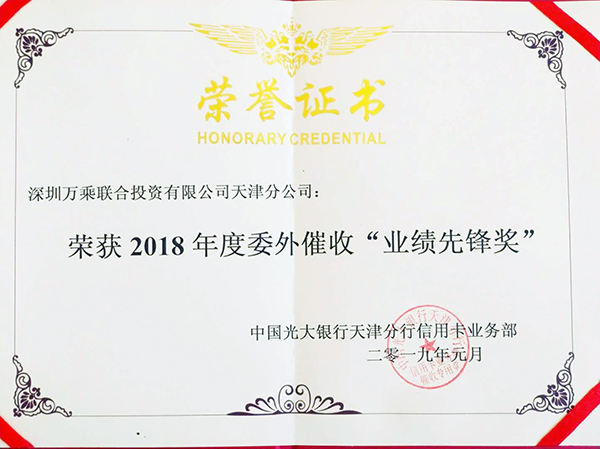会议上,光大银行天津分行信用卡中心乔总为天津万乘颁发了2018年度委外催收“业绩先锋奖”证书,杨行长对天津万乘过去一年的努力拼搏表达了衷心的感谢,对所取得的骄人成绩给予了高度评价和美好期望。