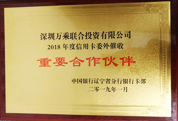 2019年1月18日,深圳万乘联合投资有限公司辽宁分公司荣获中国银行辽宁省分行颁发“2018年度信用卡委外催收重要合作伙伴奖”奖牌。
