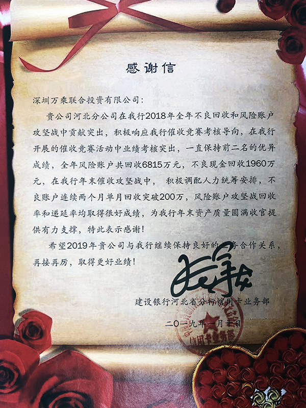 会议上,中国建设银行河北省分行信用卡部总经理张总、副总经理李总分别发表讲话。张总首先对2018年委外催收成绩进行了总结,并对石家庄万乘的各项催收活动中的配合工作表示了肯定!张总也对2019年的工作部署提出了要求和建议,催收要建立在合规合法的基础上,发挥创新思维,跟着形势的变化做出改变,同时工作中多沟通交流,为了更好的业绩努力!李总给大家说明了2019年的建行新的考核办法细则,希望我们继续积极努力完成风险及不良催收目标。