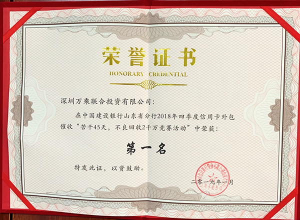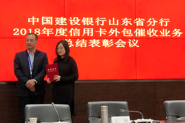 日前,中国建设银行山东省分行信用卡中心召开了2018年委外催收业务总结表彰会议,山东万乘副总经理周媛参加了会议。山东万乘荣获建设银行山东省分行举办的2018年信用卡外包催收业务“苦干45天,不良回收2千万竞赛活动”第一名。信用卡中心王总为山东万乘颁发了荣誉证书。