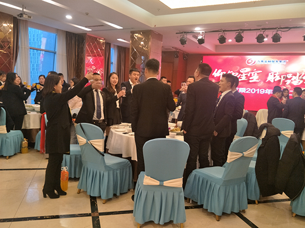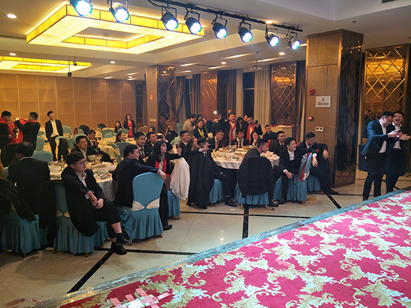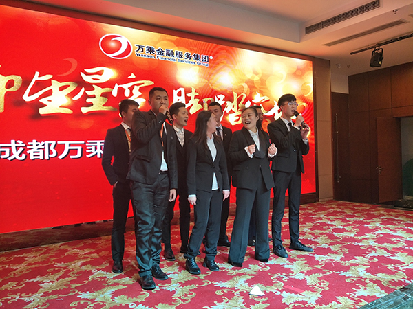 气氛严肃的会议结束后,新年团圆宴及晚会拉开序幕:胡总、白总新年祝酒,全体员工共祝集团宏图大业蒸蒸日上、成都万乘业绩长虹。晚宴开始,各位同仁们觥筹交错、把酒言欢,诉说兄弟情、同事意。
