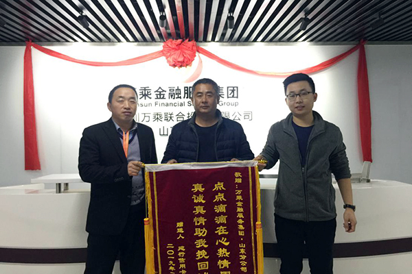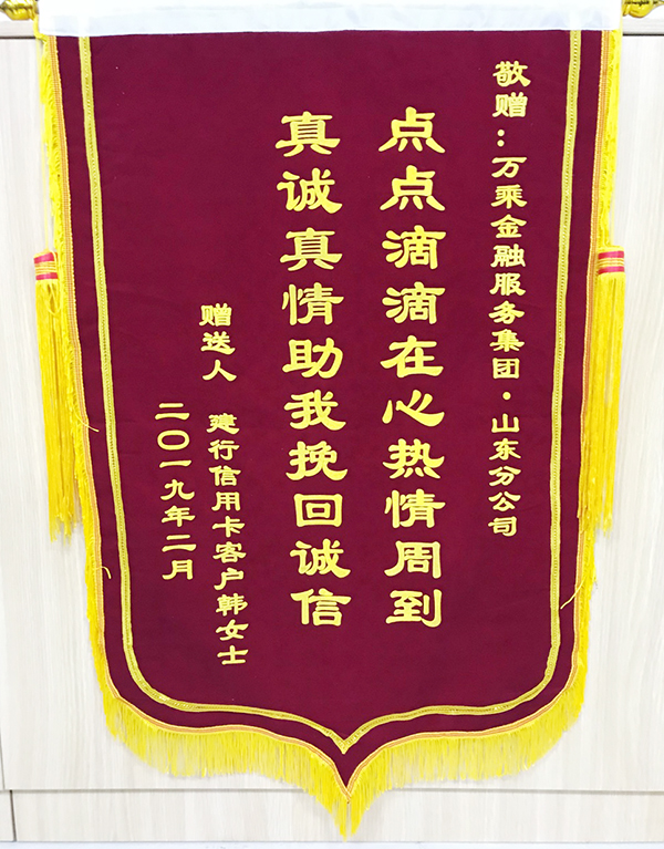 2019年2月22下午,建设银行济南分行客户韩女士一家人将一面红底金字的锦旗送到了山东万乘建行团队,上书“点点滴滴在心人情周到,真诚真情助我挽回诚信“,代表了一个建设银行持卡人对我司法务员林凡强在协助自己清偿债务过程中所做的帮助和付出。