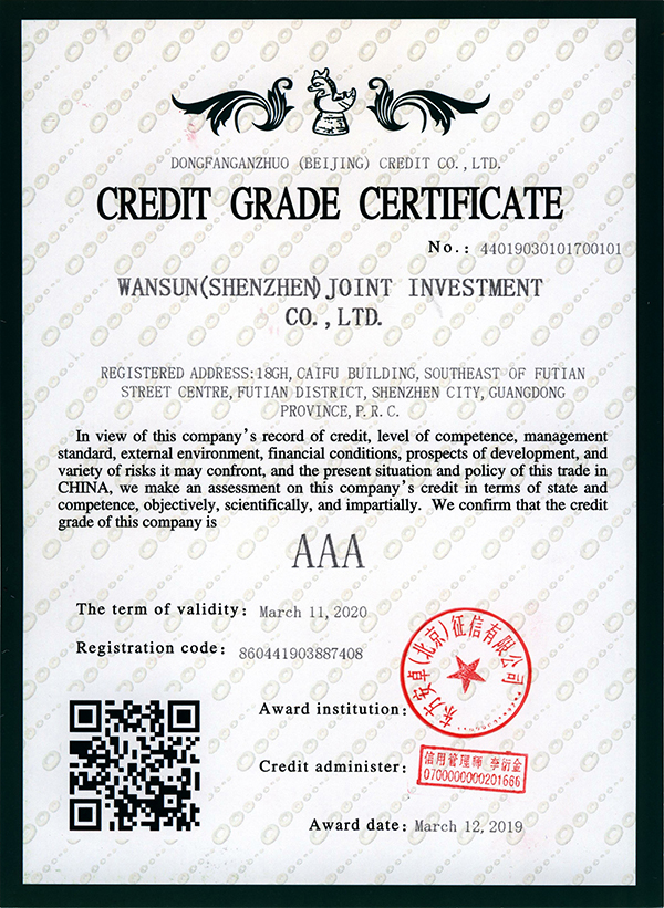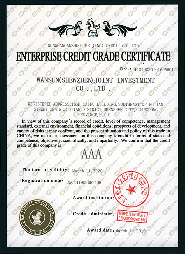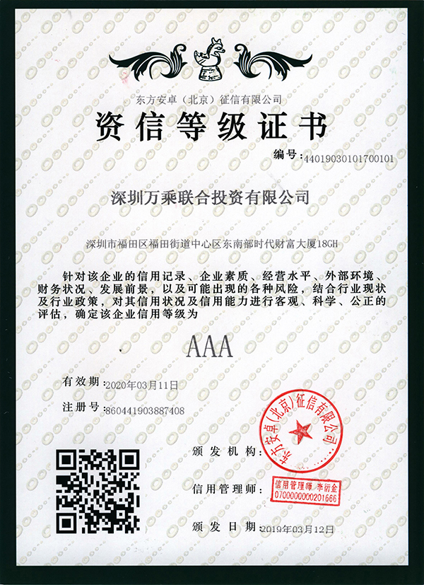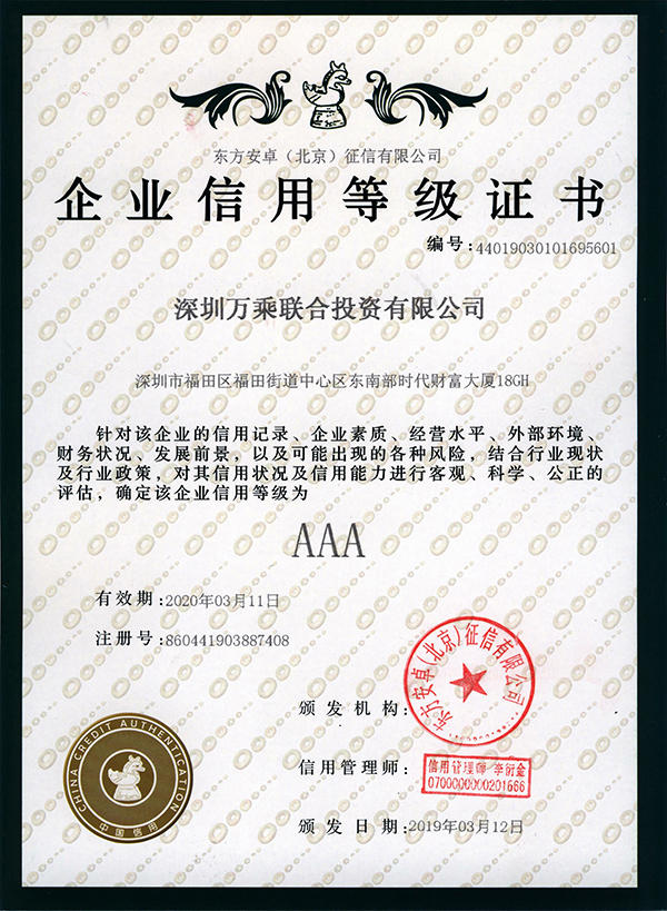 近日,深圳万乘联合投资有限公司荣获著名信用评级机构颁发AAA企业信用等级证书。此次获得3A级企业信用等级证书,标志着万乘的软实力和信誉度的提升,进一步增强了万乘的市场竞争力。