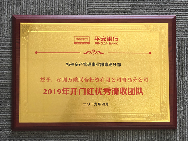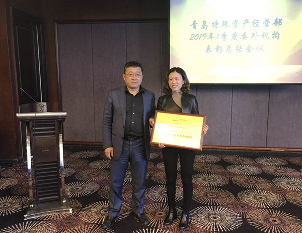 2019年4月26日,平安银行青岛特殊资产经营部召开2019年一季度委外机构表彰总结会议,我司负责人唐秀娜及业务团队负责人何治国应邀参加,并在此次会议中获得中国平安银行特殊资产管理事业部青岛分部颁发的“2019年开门红优秀清收团队”称号。