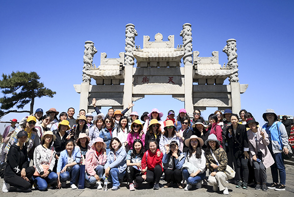 20日早上,大家轻装上阵,浩浩荡荡的队伍来到了泰山脚下,看着巍峨的山脉,脑海中浮现出《封禅大典》的场景,我们乘坐着缆车到了泰山的南天门,从南天门一路步行上山,途径天街、碧霞寺、西门神、五岳独尊、玉皇峰,一路上风景怡人,大家有说有笑的登上山顶,聚集在一起看着巍峨泰山下的一览众小。