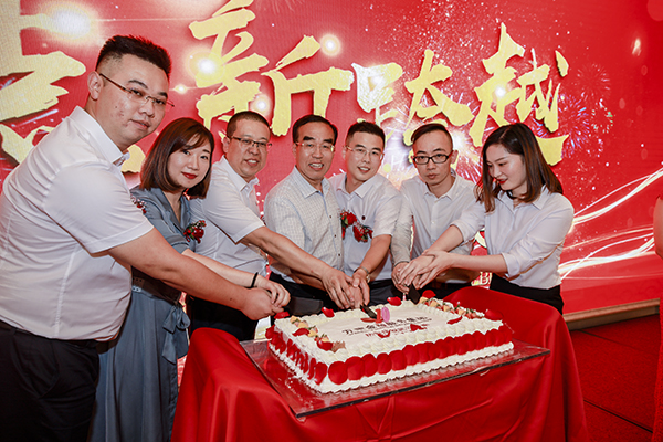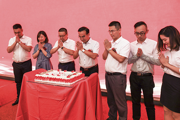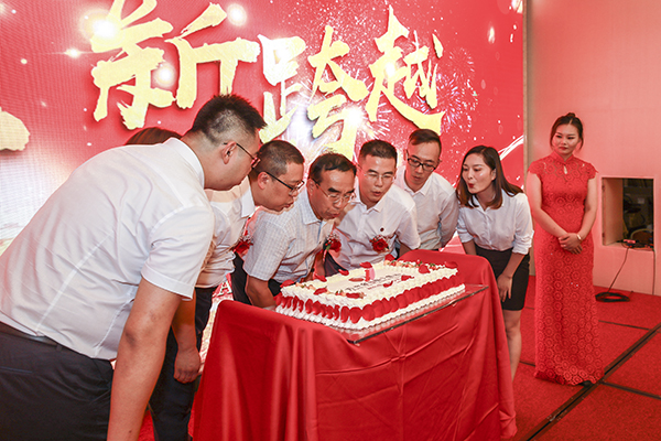 表彰会后,韩总裁与湖北大区总经理韩超、武汉万乘副总经理白云冰、襄阳万乘总经理助理甘涌、优秀员工代表胡峥坤、柯梦,以及曾在武汉万乘工作过的泉州万乘副总经理任然,在全体人员合唱的生日歌中,一起许愿,一起吹熄蜡烛,一起切开生日蛋糕,一起开启胜利的香槟酒,祝武汉分公司10岁生日快乐。