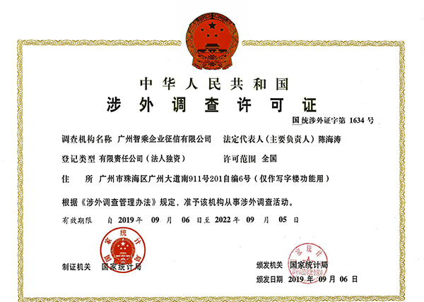 此次获得《涉外调查许可证》让广州智乘征信公司的调查工作如虎添翼,中华人民共和国境外的组织需要在中华人民共和国境内进行统计调查活动的,均可委托具备资质的广州智乘征信公司来合法合规地进行。这是广州智乘征信公司推进海外业务的大跨步,也充分体现了主管部门对广州智乘征信公司的服务口碑、业务能力的肯定和信任。